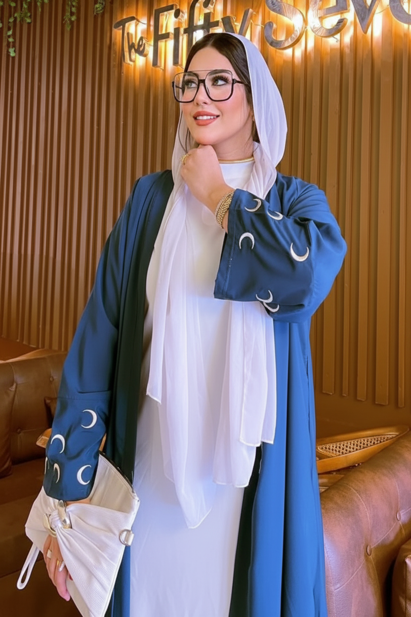 Light Open kaftan embroidered with white and beige crescent on the cuffs.