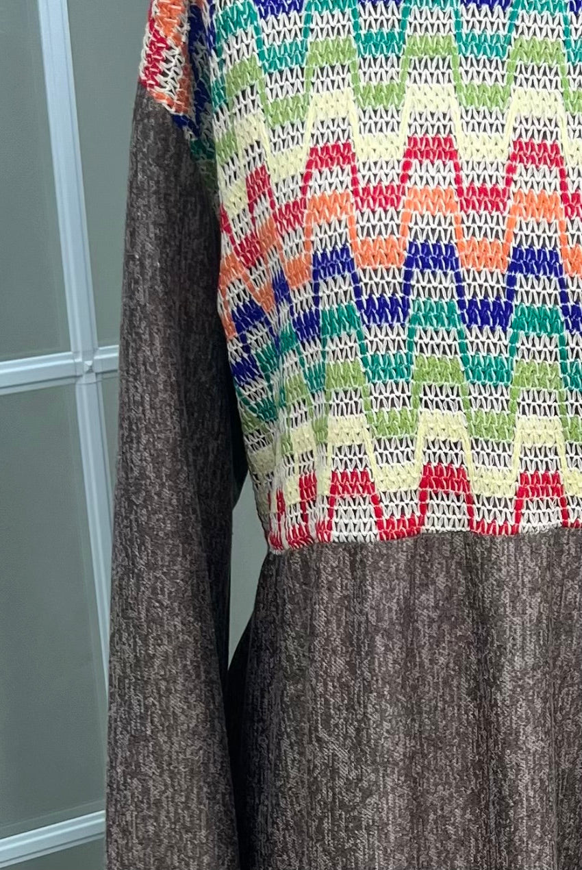 Layered comfy dress with elastic cuff and attached belt in the back , comfortable for everyday wear.