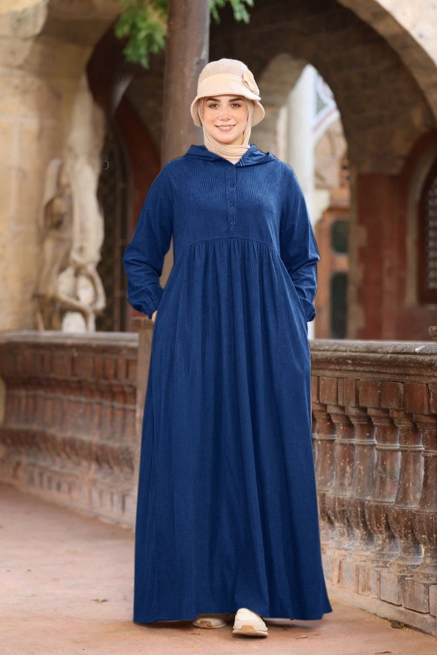 Dress with hoodie , buttons on the chest and two pockets .