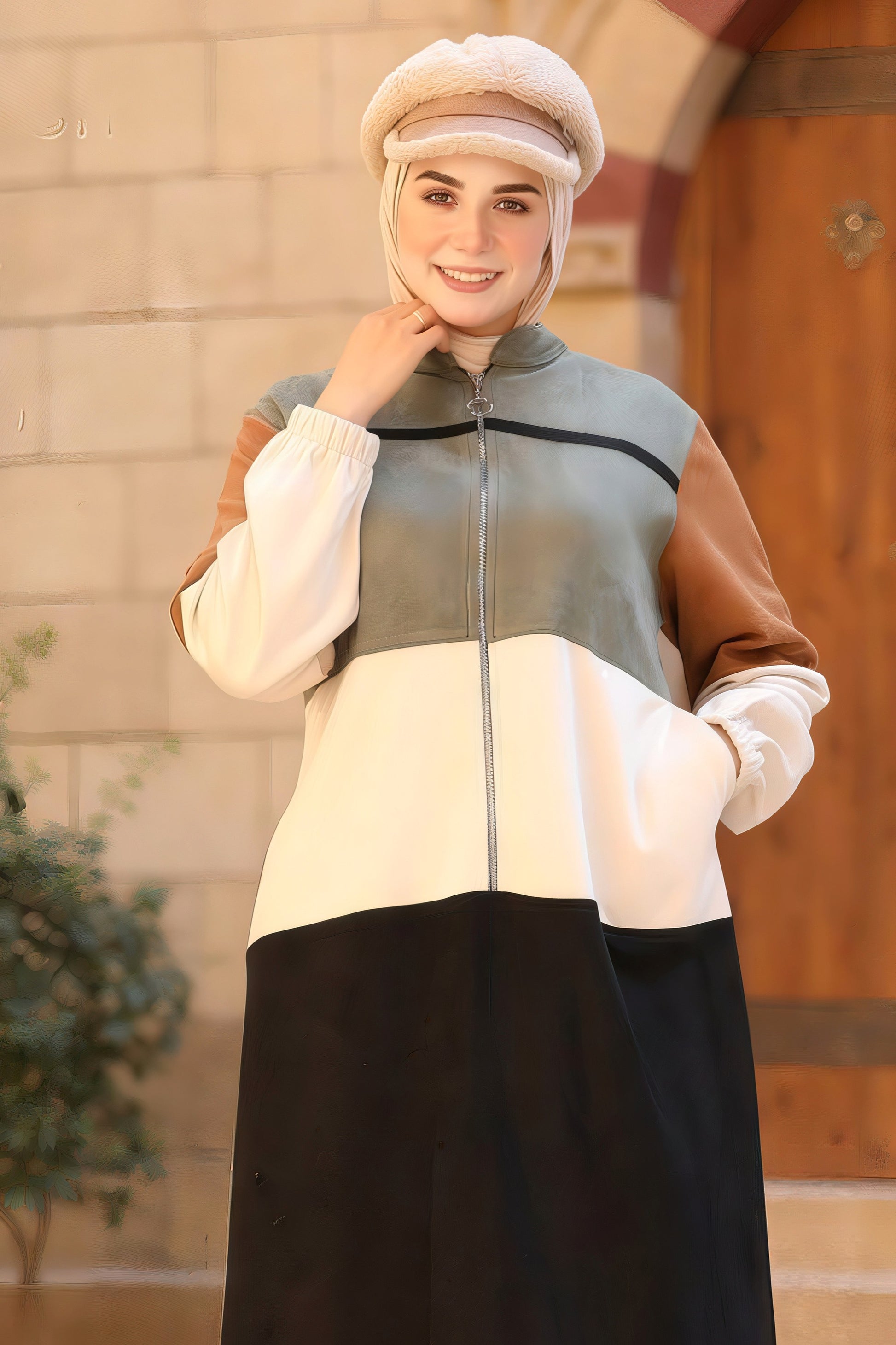 Dress-multicolor with half zip till the waist and two pockets.