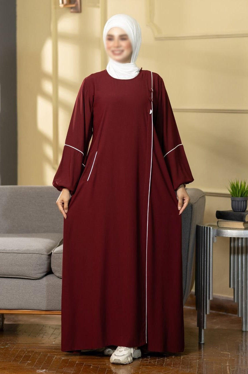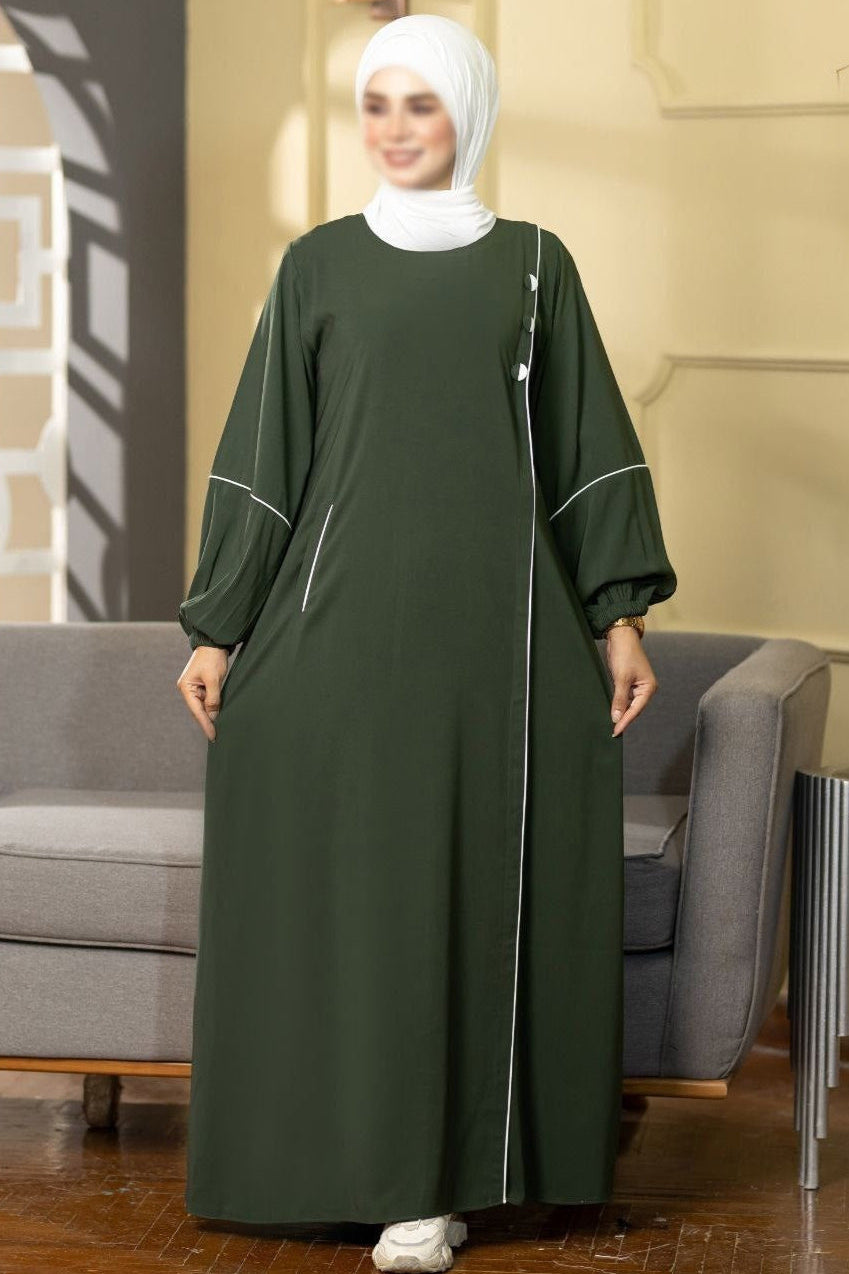 Simple design abaya with puff sleeves and one pocket and three decorating buttons.